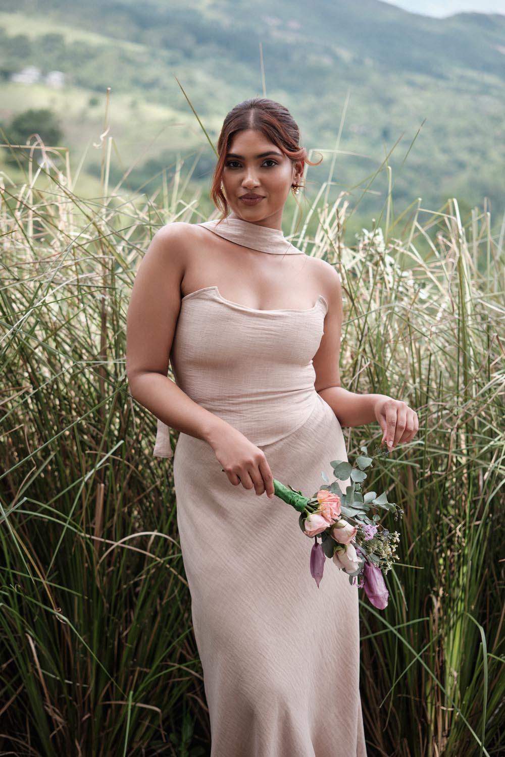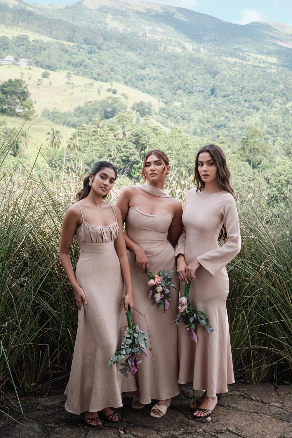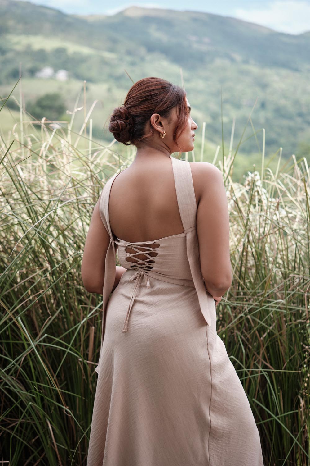 A coordinated three-piece set featuring a structured corset top, bias-cut maxi skirt, and matching scarf. The corset top has a fitted silhouette with a lace-up back for an adjustable fit. The bias-cut skirt falls softly over the body for a flattering, effortless drape. The lightweight scarf can be styled around the neck or as an accent accessory.