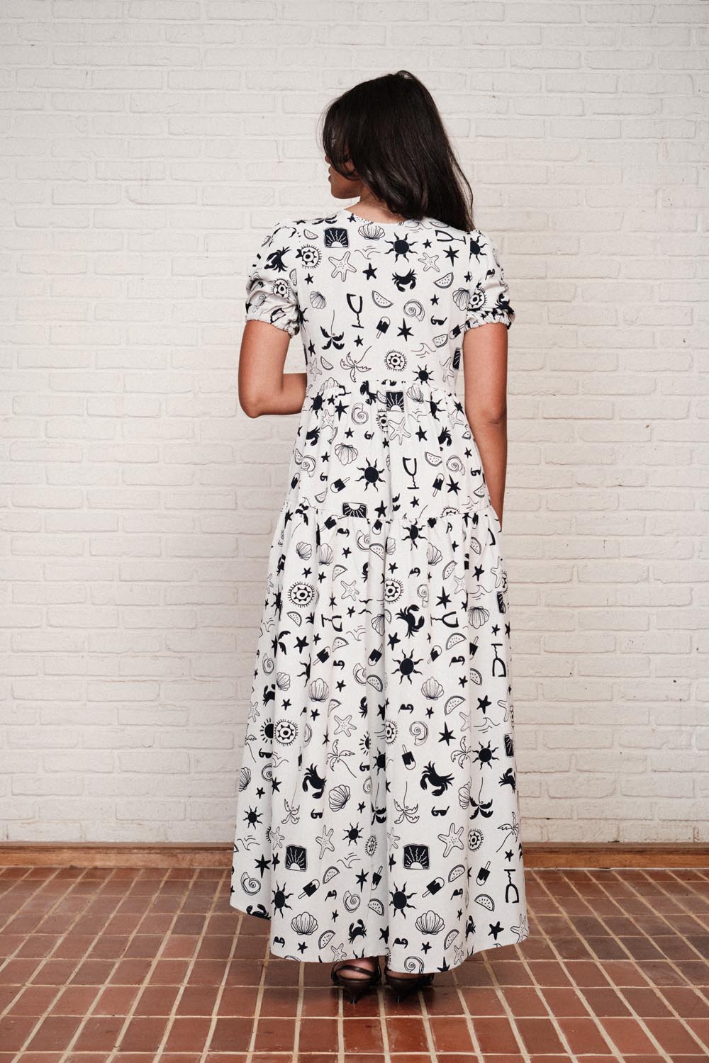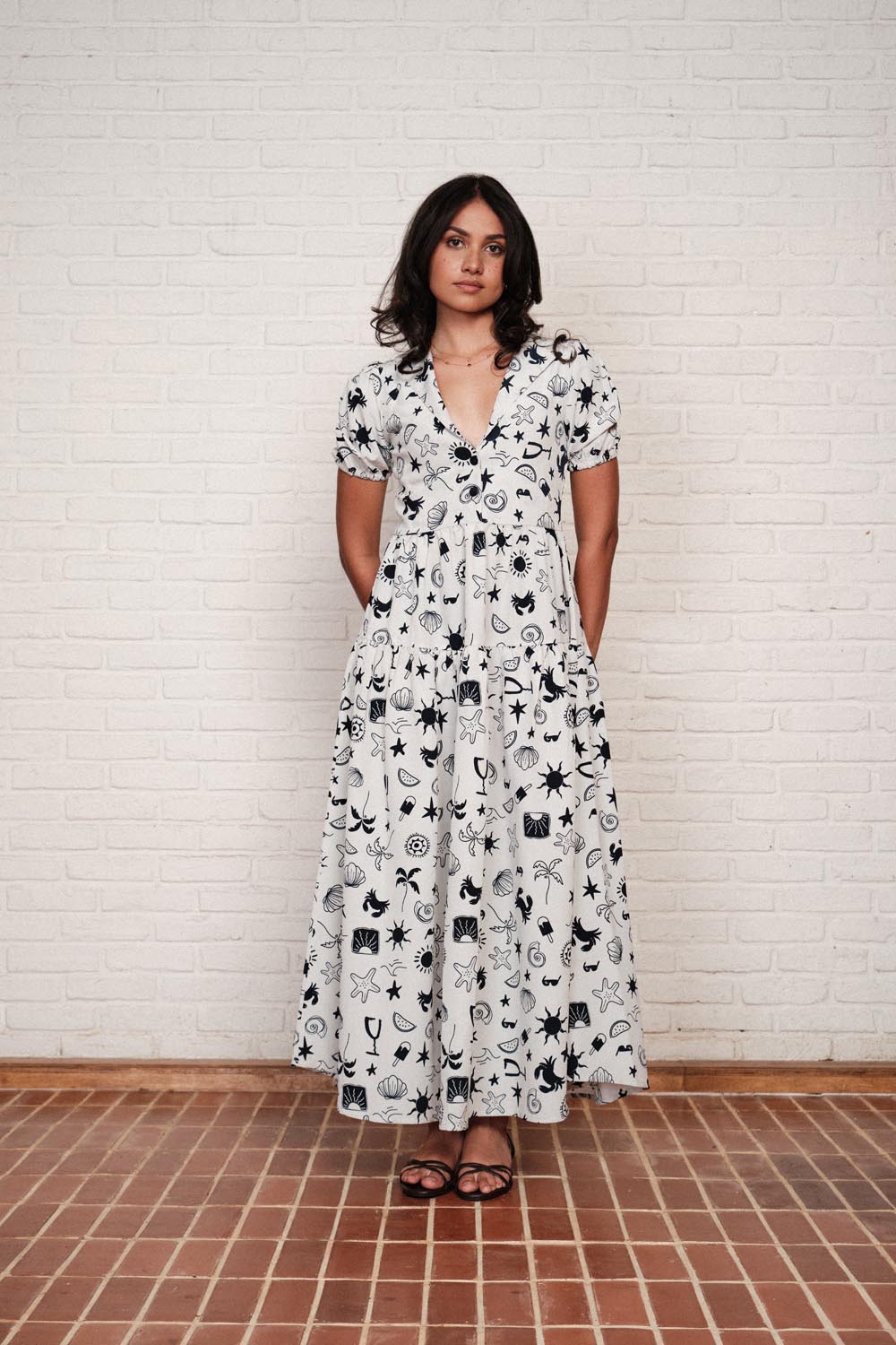 This dress is cut in a flattering A-line silhouette and features our Sea Print, inspired by summer memories and coastal charm. Designed with a button-down bodice, V-neckline, short gathered sleeves, and tiered skirt panels, this midi dress offers a relaxed fit.