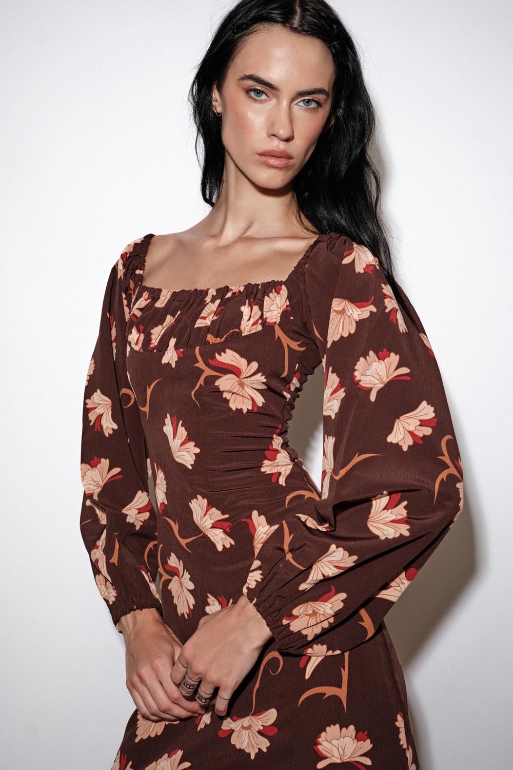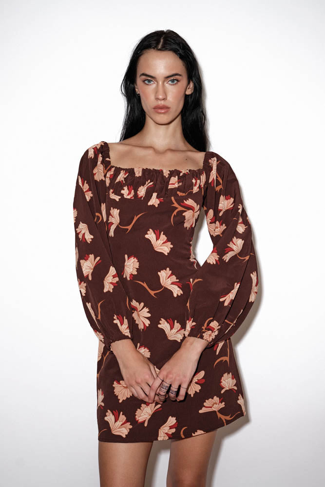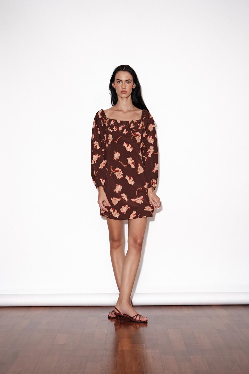In our exclusive Butter Pea Floral print, this mini dress features a square neckline with subtle gathers at the bust, long sleeves with elasticated cuffs, and a fitted bodice that shapes the waist. Designed with a low scoop back and a concealed back zipper for a secure fit, it falls into a clean, slightly flared mini hem.