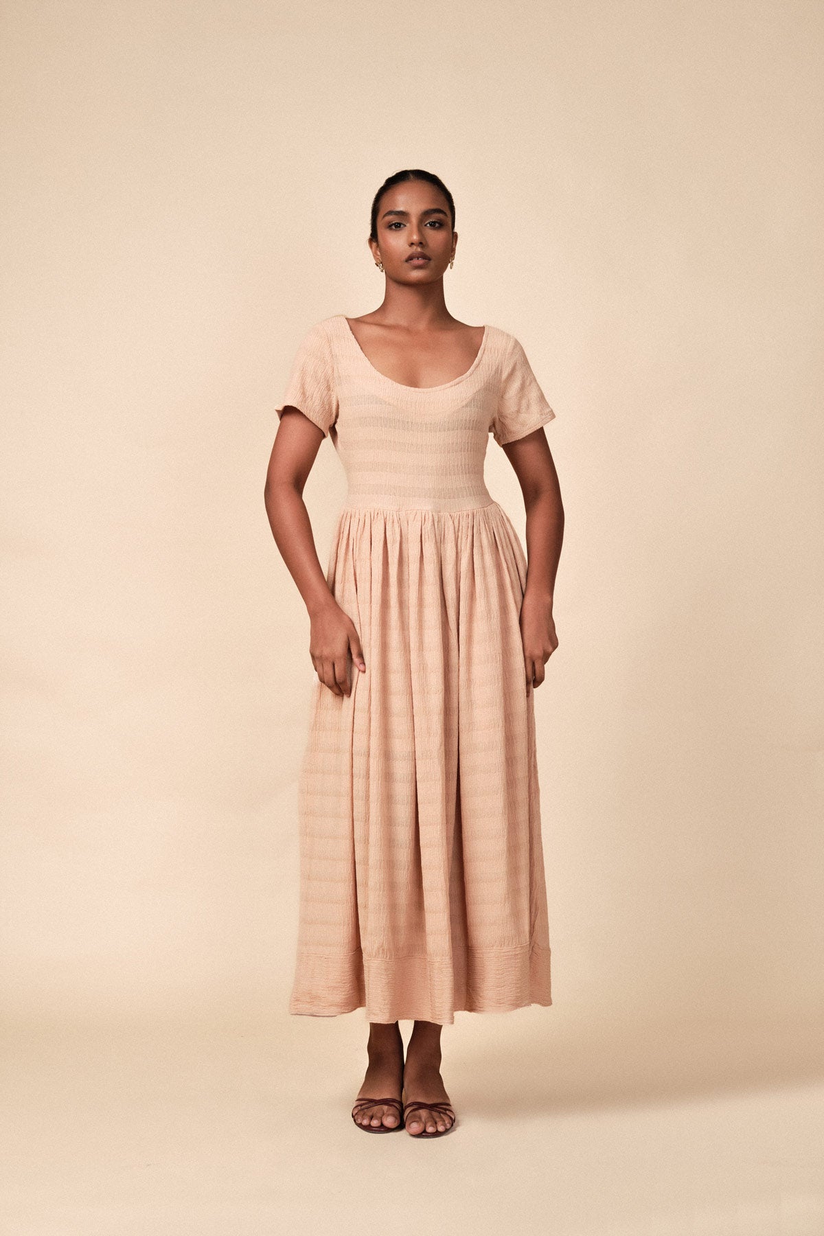 Elegant and flattering, this dress in our soft peach crepe is a timeless addition to any wardrobe. Designed with a fitted bodice, scoop neckline, and short sleeves, it offers a clean and classic silhouette that transitions effortlessly from day to evening.