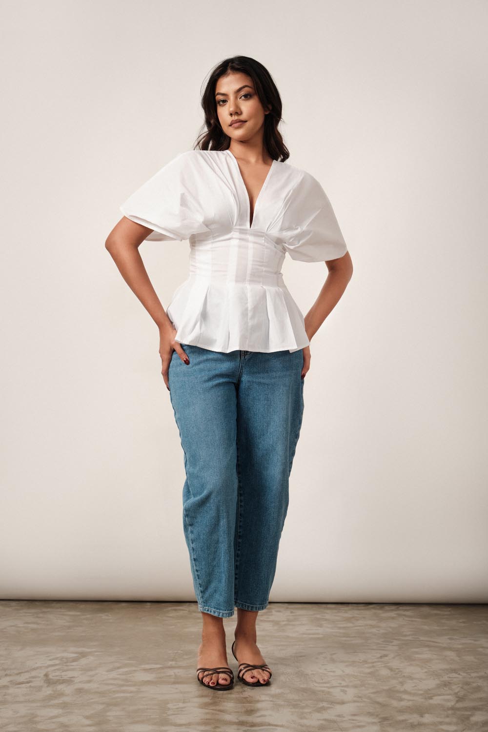 -Deep neck top with fitted waist