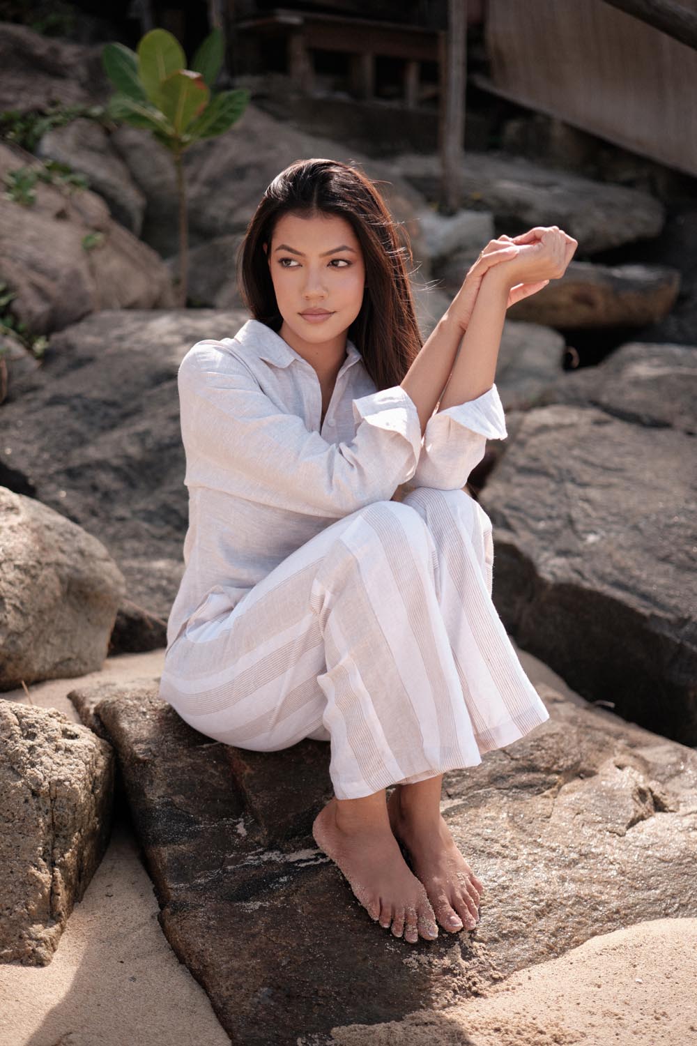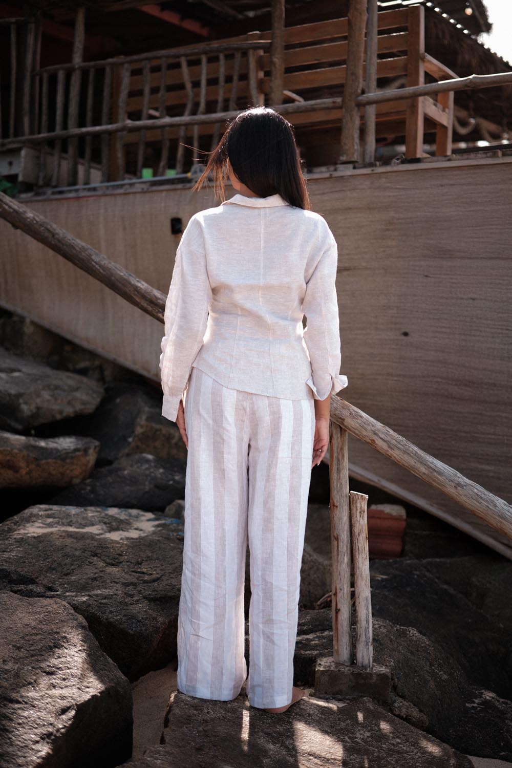 Crafted from lightweight linen, these pants feature a wide-leg silhouette with soft vertical stripes for a flattering fit. Designed with an adjustable drawstring waist, they offer all-day comfort while maintaining a polished look. Perfect for pairing with shirts, tops, or linen layers, making them a versatile wardrobe essential.