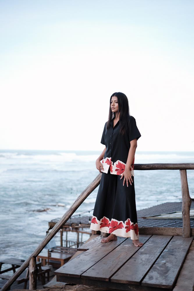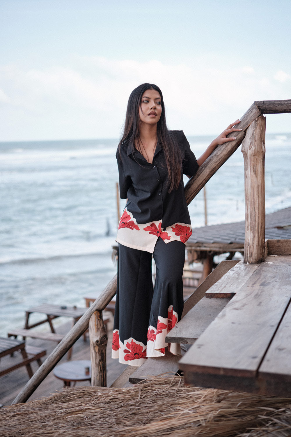 A timeless silhouette with bold detailing. This short-sleeve black shirt features a straight cut with a crisp collar and is finished with a striking floral border in vibrant red set against a soft ivory band. Versatile and refined, it pairs beautifully with wide-leg trousers or can be styled on its own for a statement look. Designed with comfort in mind, it’s ideal for both coastal escapes and city days.